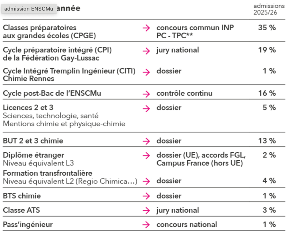 Seuls les titulaires d'un M1 de chimie, Chimie-Physique ou Sciences et Techniques ont accès à l'admission sur titre en 2ème année de cycle ingénieur. Ils peuvent être admis et suivre le programme normal des enseignements dispensés aux élèves-ingénieurs de 2ème année.